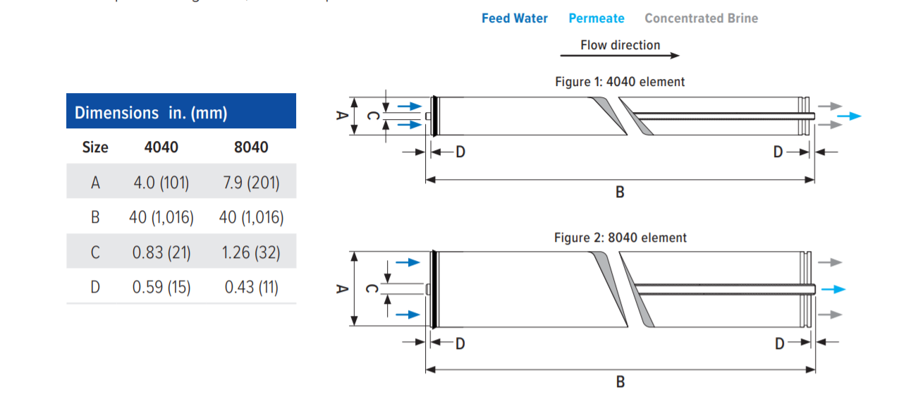Название Диаметр, дюйм Площадь поверхности мембраны, ft² (м²) Селективность, % Производительность, GPD (м³/сут)